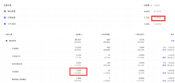 2.付费流量中直通车占流量主导,但是引流成本比较高,ppc也在1.3左右,普遍高于同行,转化率很低拉低整体转化,需要降低引流成本,提升转化率。